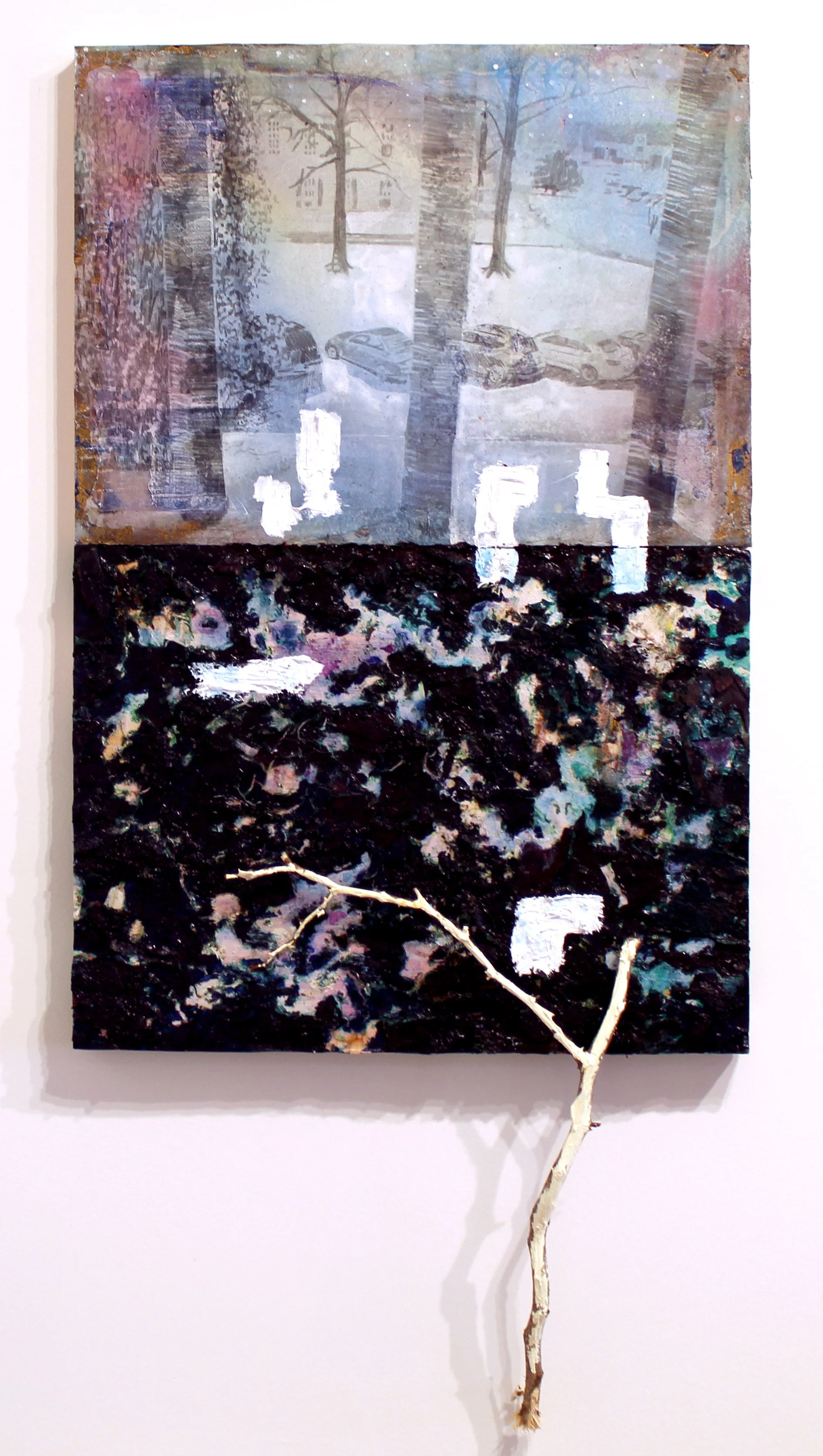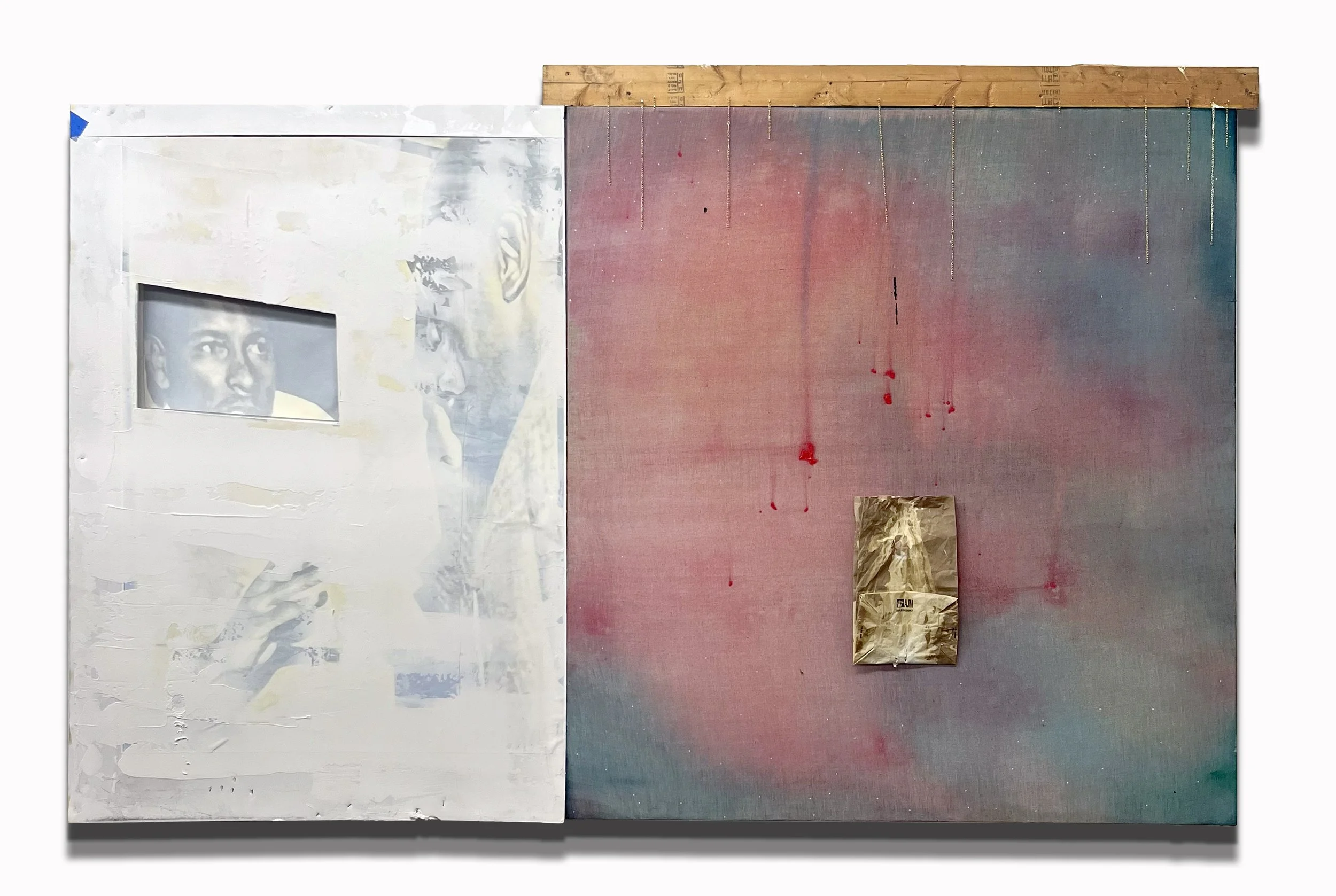 Each of the paintings in this exhibition are made from materials otherwise bound for the trash. Discarded materials in form and concept.